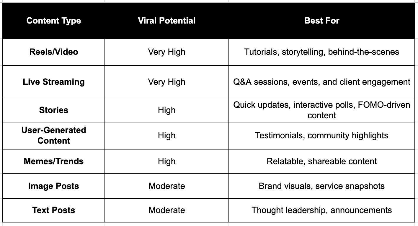 - Focus on content that converts: short-form video, Reels, special offers, or posts designed to drive specific actions usually give the best return.